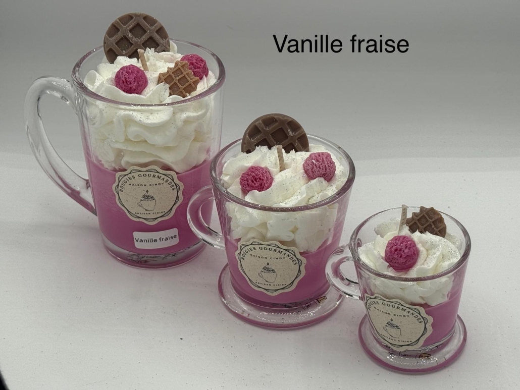 Plongez dans un univers sucré avec notre bougie gourmande vanille fraise artisanale, une création unique qui allie esthétisme et parfum délicat.